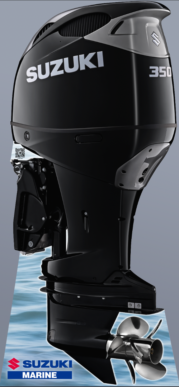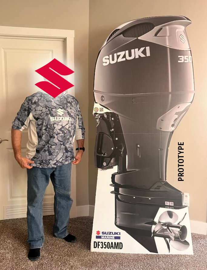 Our largest and most impressive lightweight engine displays are designed for easy folding and transport to any event or weekend boat show. While nothing beats showing a real Suzuki Outboard motor to customers, these high-resolution, UV-printed polystyrene cutouts are the absolute next best thing. Weighing about 9 lbs and standing 6 to 7 feet tall, they look remarkably lifelike and set up quickly with a folding easel back for stability. Lightweight and simple to handle, they save you from hauling heavy engines while still making a strong impact. They're great and lightweight, but be aware, we'd limit using in high-wind events! Engine standup includes a QR code linking to up-to-date engine details on SuzukiMarine.com.